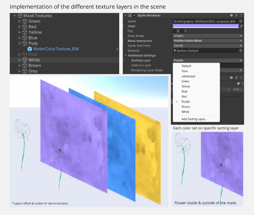 - Placed the BW texture in the scene, colored it with the spriterenderer to a specific color & setting it to a specific sorting layer.